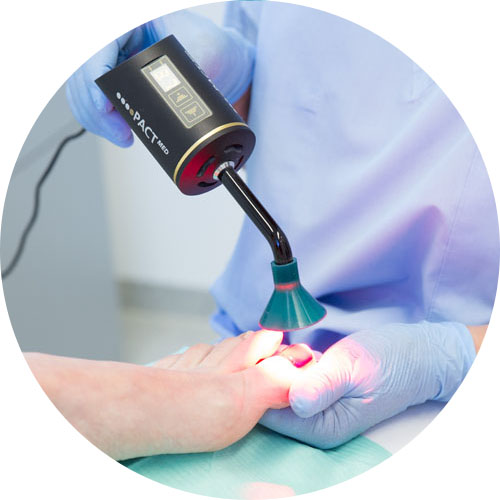 Die Behandlung der Nagelpilzinfektionen ist sehr langwierig und zeitaufwendig. Je nach Schweregrad des Befalles werden antimykotische Salben, Lacke, Tinkturen oder Medikamente eingesetzt. Desweiteren wird in unserer Praxis die „Photodynamische Antimikrobielle Therapie“ des Nagelpilzes (PACT) angeboten, bei der der befallene Nagel mit Hilfe eines lichtaktivierbaren Farbstofffes und speziellem Licht behandelt wird. Bei einer gesicherten Diagnose „Nagelpilzinfektion“ besteht neben den herkömmlichen Therapieformen zudem noch die Möglichkeit einer FOX-Lasertherapie.
